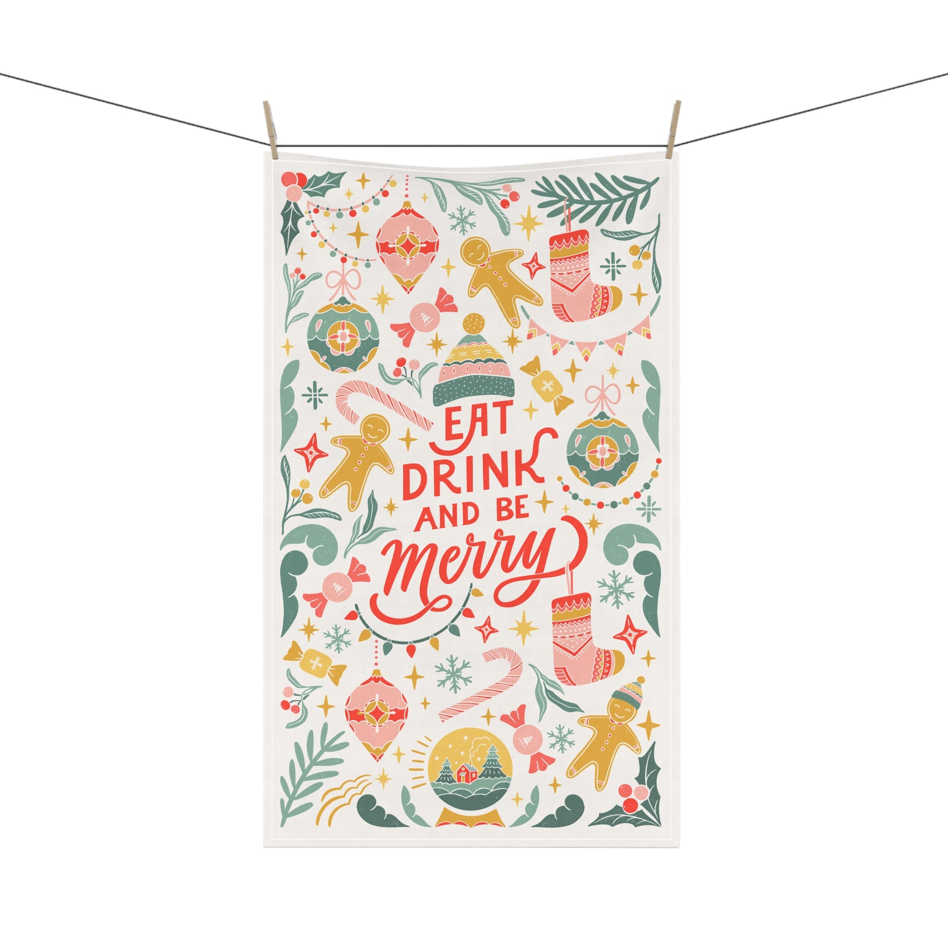 A vibrant and festive illustrated tea towel perfect for adding a touch of cheer to your kitchen decor. This tea towel is ideal for those who love to entertain and host gatherings, bringing a festive atmosphere to any occasion. Perfect for holiday season, special celebrations, and everyday use.